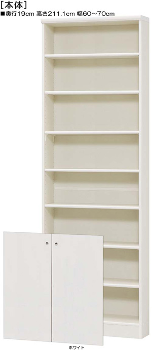 下扉付き薄型書斎ラック 高さ211.1cm幅60~70cm奥行19cm 標準棚板1.7cm厚 オプション一覧