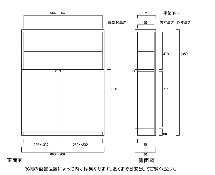 本体扉 幅15~44cmは片開き扉(右開き・左開きをご選択) 高さ135cm以上は上下分割扉