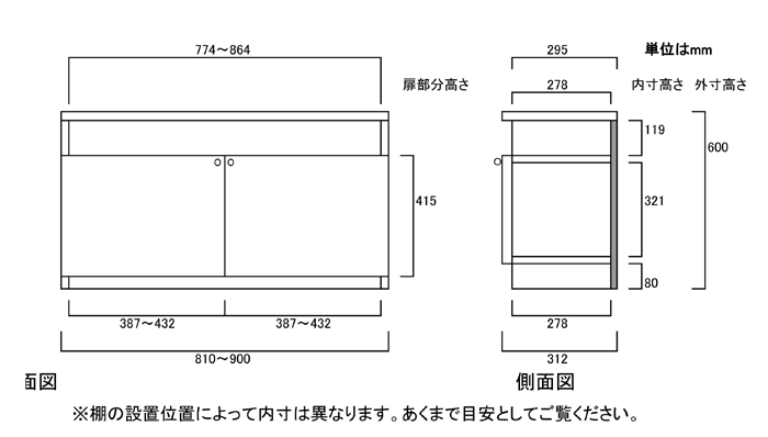 本体扉 幅45~90cmは両開き扉 高さ135cm以上は上下分割扉