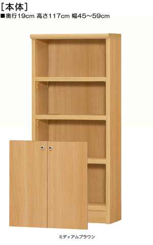 下扉付き薄型ロフト頑丈ラック 高さ117cm幅45~59cm奥行19cm厚棚板 扉高52.5cm