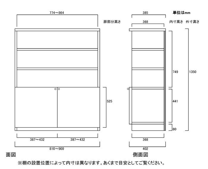 本体扉 幅45~90cmは両開き扉 高さ135cm以上は上下分割扉