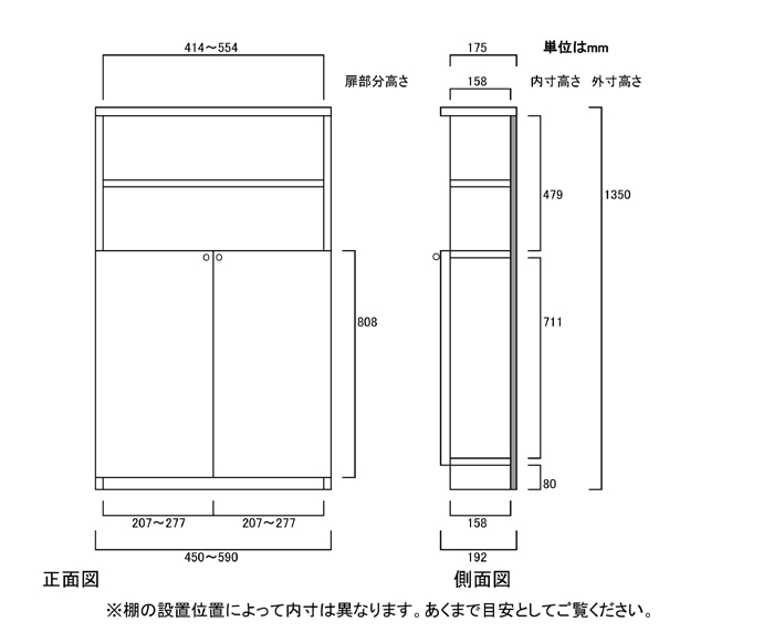 本体扉 幅15~44cmは片開き扉(右開き・左開きをご選択) 高さ135cm以上は上下分割扉