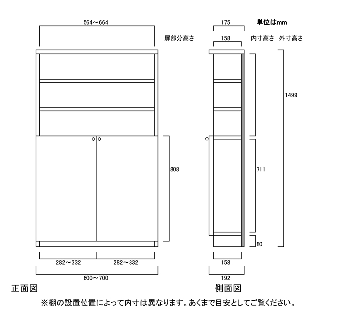 本体扉 幅15~44cmは片開き扉(右開き・左開きをご選択) 高さ135cm以上は上下分割扉