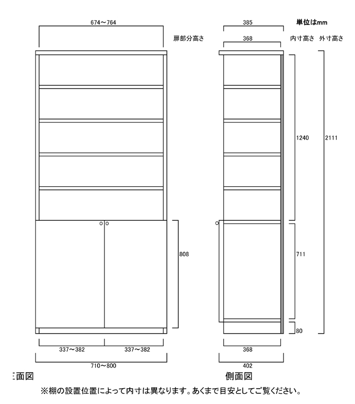 本体扉 幅15~44cmは片開き扉(右開き・左開きをご選択) 高さ135cm以上は上下分割扉