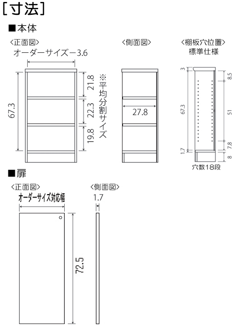本体扉 幅15~44cmは片開き扉(右開き・左開きをご選択) 高さ135cm以上は上下分割扉