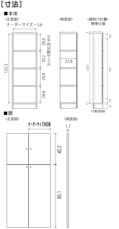 本体扉 幅15~44cmは片開き扉(右開き・左開きをご選択) 高さ135cm以上は上下分割扉