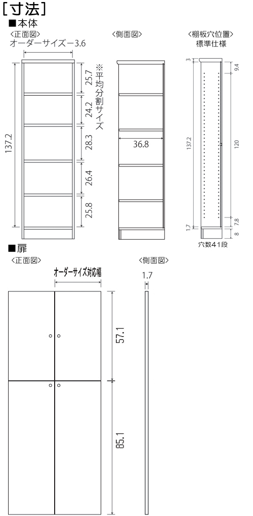本体扉 幅15~44cmは片開き扉(右開き・左開きをご選択) 高さ135cm以上は上下分割扉