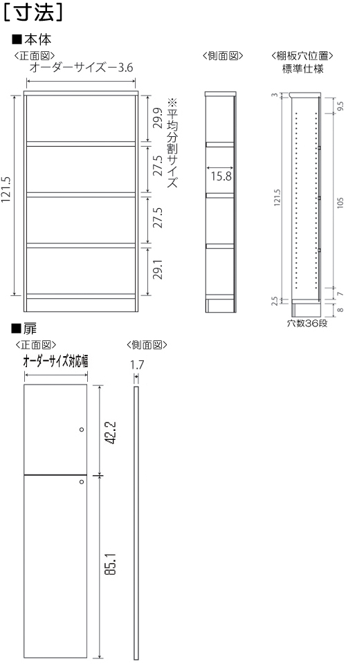 本体扉 幅15~44cmは片開き扉(右開き・左開きをご選択) 高さ135cm以上は上下分割扉