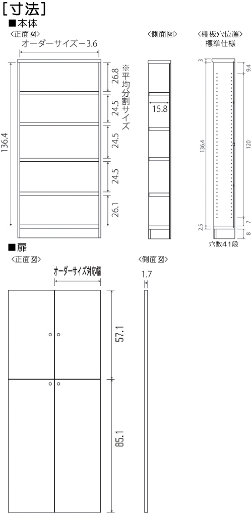 本体扉 幅15~44cmは片開き扉(右開き・左開きをご選択) 高さ135cm以上は上下分割扉