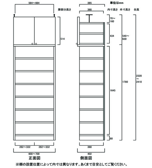 - ■外寸奥行40cm×高さ232~241cm×幅60~70cm(幅は1cm単位でオーダーできます)