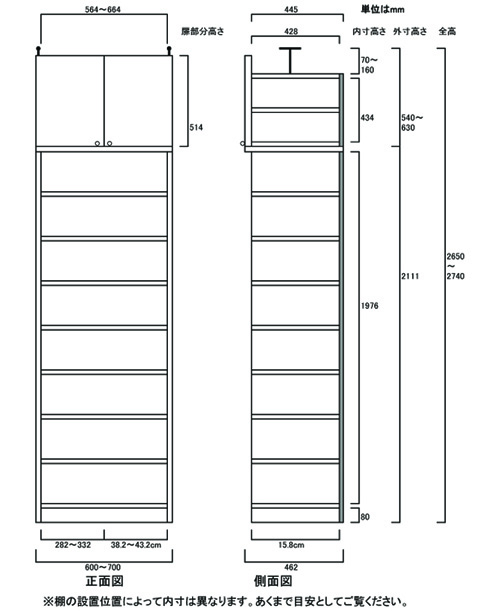 - ■外寸奥行46cm×高さ265.1~274.1cm×幅60~70cm(幅は1cm単位でオーダーできます)