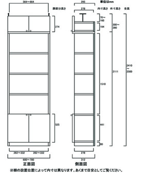 • ■外寸奥行31cm×高さ241.1~250.1cm×幅60~70cm(幅は1cm単位でオーダーできます)