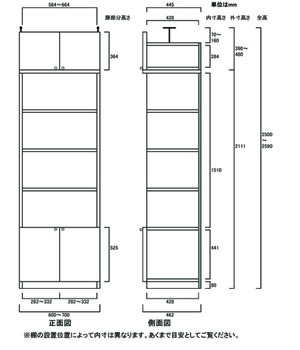 - ■外寸奥行46cm×高さ250.1~259.1cm×幅60~70cm(幅は1cm単位でオーダーできます)