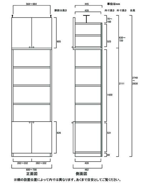 • ■外寸奥行46cm×高さ274.1~283.1cm×幅60~70cm(幅は1cm単位でオーダーできます)