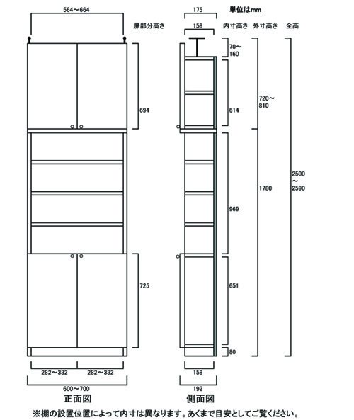 • ■外寸奥行19cm×高さ250~259cm×幅60~70cm(幅は1cm単位でオーダーできます)