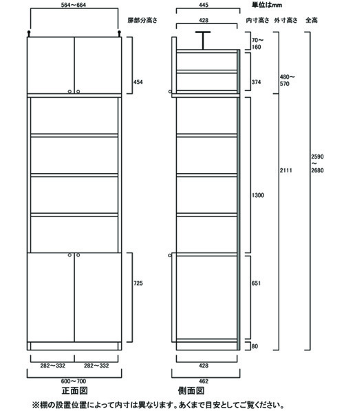- ■外寸奥行46cm×高さ259.1~268.1cm×幅60~70cm(幅は1cm単位でオーダーできます)