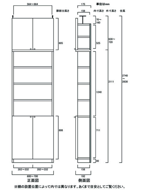 • ■外寸奥行19cm×高さ274.1~283.1cm×幅60~70cm(幅は1cm単位でオーダーできます)
