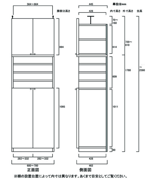 - ■外寸奥行46cm×高さ250~259cm×幅60~70cm(幅は1cm単位でオーダーできます)