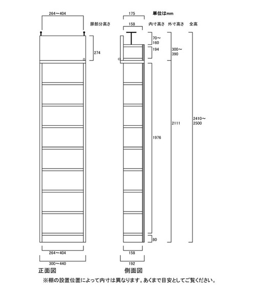 - ■外寸奥行19cm×高さ241.1~250.1cm×幅30~44cm(幅は1cm単位でオーダーできます)