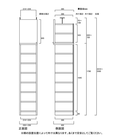 - ■外寸奥行40cm×高さ241~250cm×幅25~29cm(幅は1cm単位でオーダーできます)