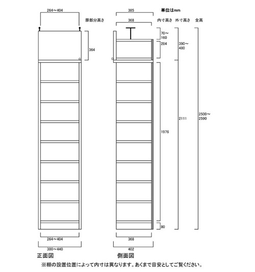 • ■外寸奥行40cm×高さ250.1~259.1cm×幅30~44cm(幅は1cm単位でオーダーできます)