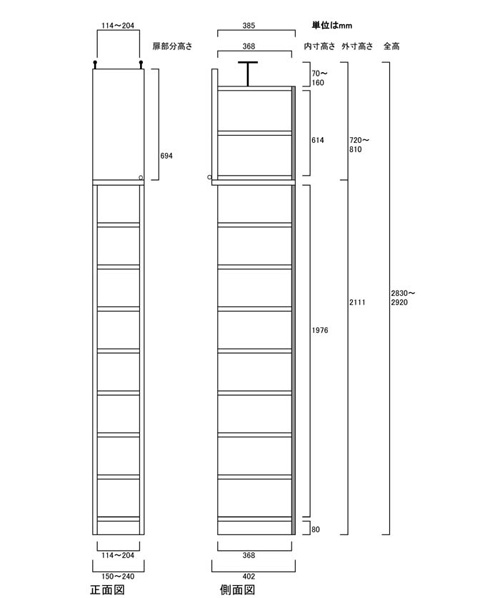 - ■外寸奥行40cm×高さ265.1~274.1cm×幅15~24cm(幅は1cm単位でオーダーできます)