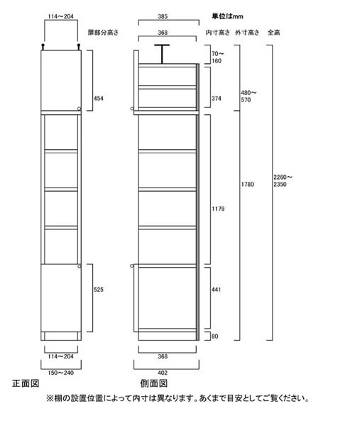 - ■外寸奥行40cm×高さ226~235cm×幅15~24cm(幅は1cm単位でオーダーできます)