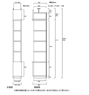 • ■外寸奥行40cm×高さ250.1~259.1cm×幅15~24cm(幅は1cm単位でオーダーできます)