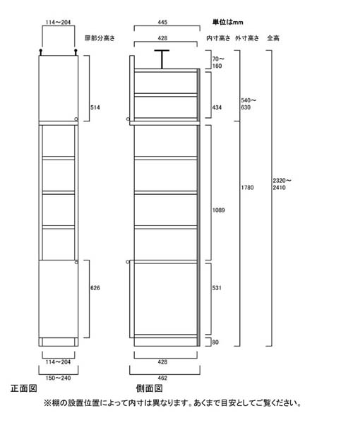 - ■外寸奥行46cm×高さ232~241cm×幅15~24cm(幅は1cm単位でオーダーできます)