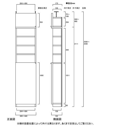 - ■外寸奥行19cm×高さ250.1~259.1cm×幅30~44cm(幅は1cm単位でオーダーできます)