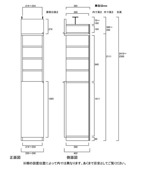 奥行40cm×高さ241.1~250.1cm×幅25~29cm