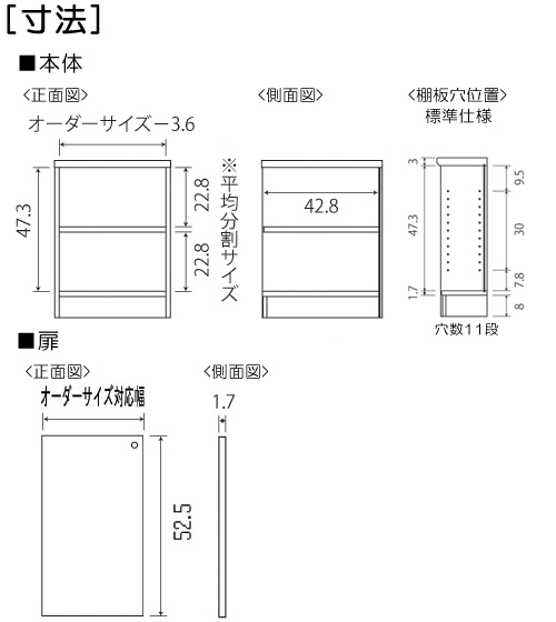 本体扉 幅15~44cmは片開き扉(右開き・左開きをご選択) 高さ135cm以上は上下分割扉