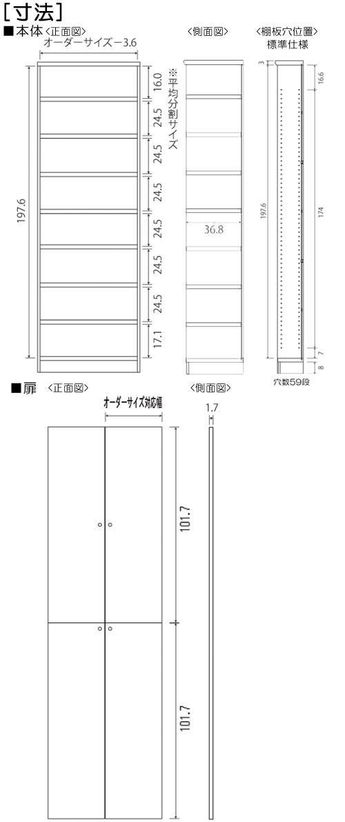 本体扉 幅15~44cmは片開き扉(右開き・左開きをご選択) 高さ135cm以上は上下分割扉