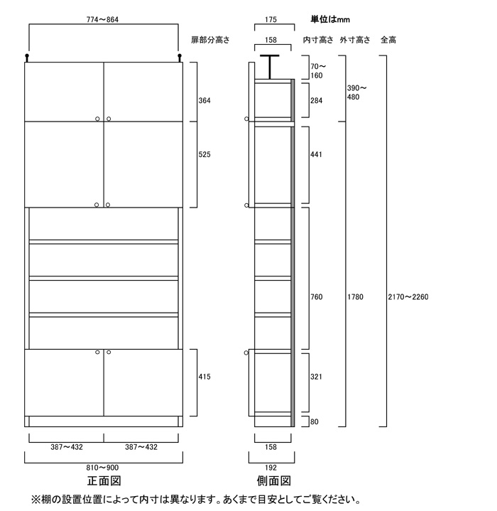 - ■上棚高さ高さ32cm+伸縮突っ張り金具(扉付き)