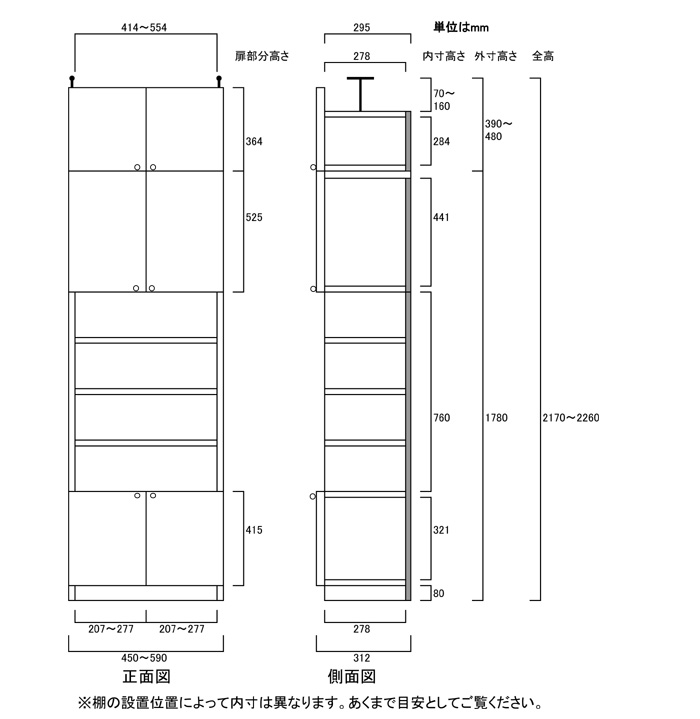 • ■外寸奥行31cm×高さ217~226cm×幅45~59cm(幅は1cm単位でオーダーできます)