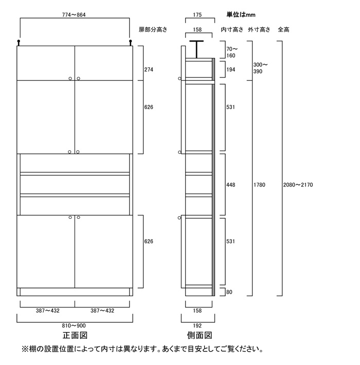 - ■上棚高さ高さ23cm+伸縮突っ張り金具(扉付き)