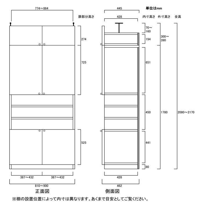 • ■外寸奥行46cm×高さ208~217cm×幅81~90cm(幅は1cm単位でオーダーできます)
