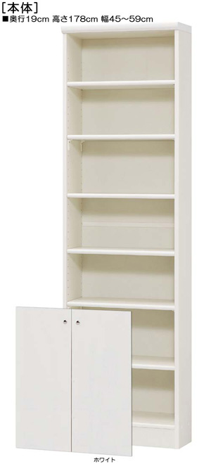 • 下扉付き薄型リビングラック 高さ178cm幅45~59cm奥行19cm 標準棚板1.7cm厚 棚板耐荷重:4Kg 扉高62.6cm