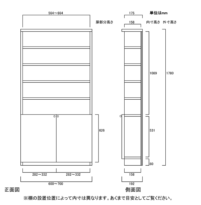 本体扉 幅15~44cmは片開き扉(右開き・左開きをご選択) 高さ135cm以上は上下分割扉