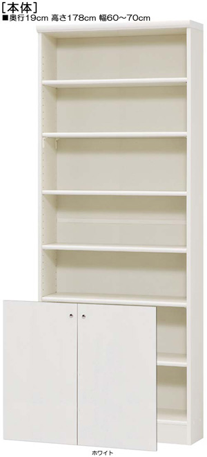 • 下扉付き薄型リビングラック 高さ178cm幅60~70cm奥行19cm 標準棚板1.7cm厚 棚板耐荷重:4Kg 扉高62.6cm