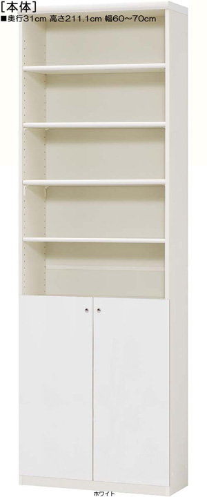 • 下扉付きA4書斎ラック 高さ211.1cm幅60~70cm奥行31cm 標準棚板1.7cm厚 棚板耐荷重:4Kg 扉高80.8cm