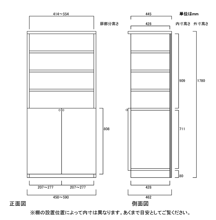 下扉付き奥深リビングラック 高さ178cm幅45~59cm奥行46cm 標準棚板1.7cm厚 オプション一覧