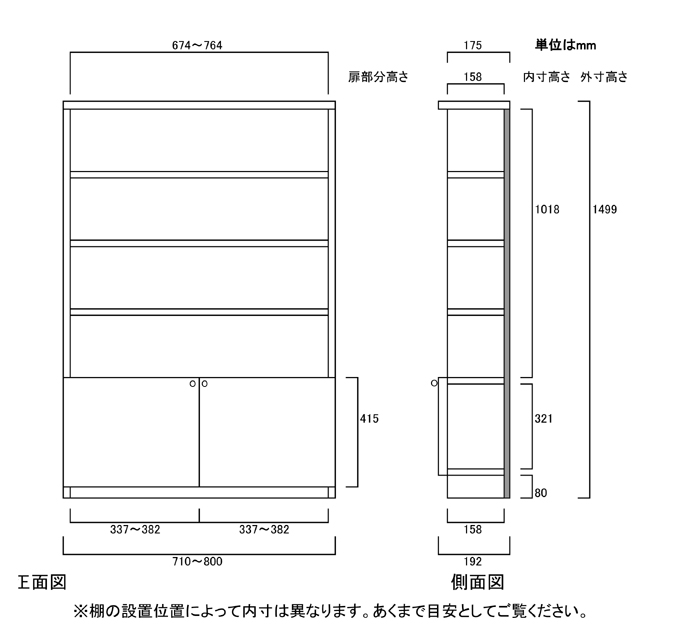 全面扉・下から扉・上置き棚扉・オープン、右開き・左開きなど自由選択。幅広型は両開き。
