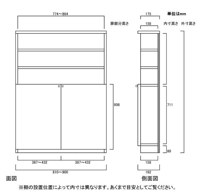 全面扉・下から扉・上置き棚扉・オープン、右開き・左開きなど自由選択。幅広型は両開き。