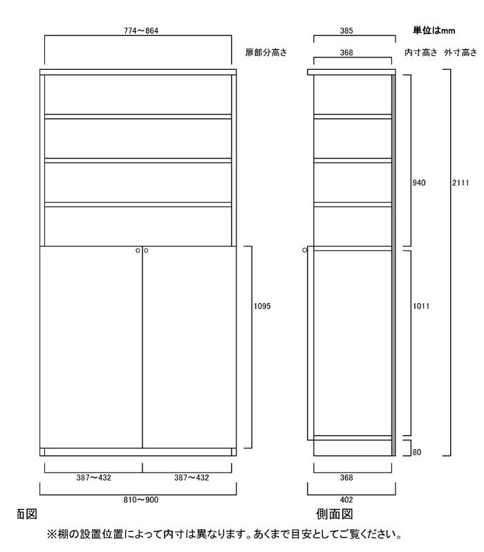 全面扉・下から扉・上置き棚扉・オープン、右開き・左開きなど自由選択。幅広型は両開き。