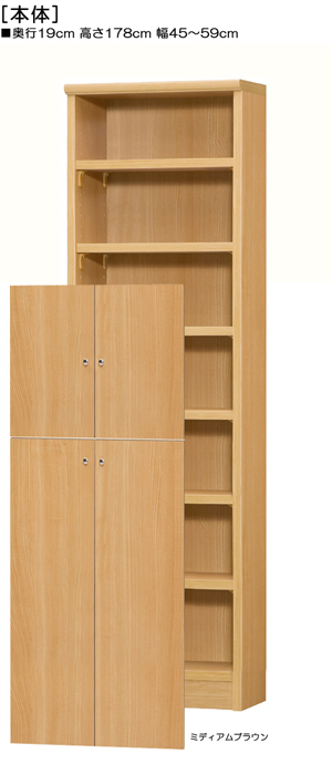下扉付き薄型リビング頑丈ラック 高さ178cm幅45~59cm奥行19cm厚棚板 厚棚板2.5cm厚 オプション一覧