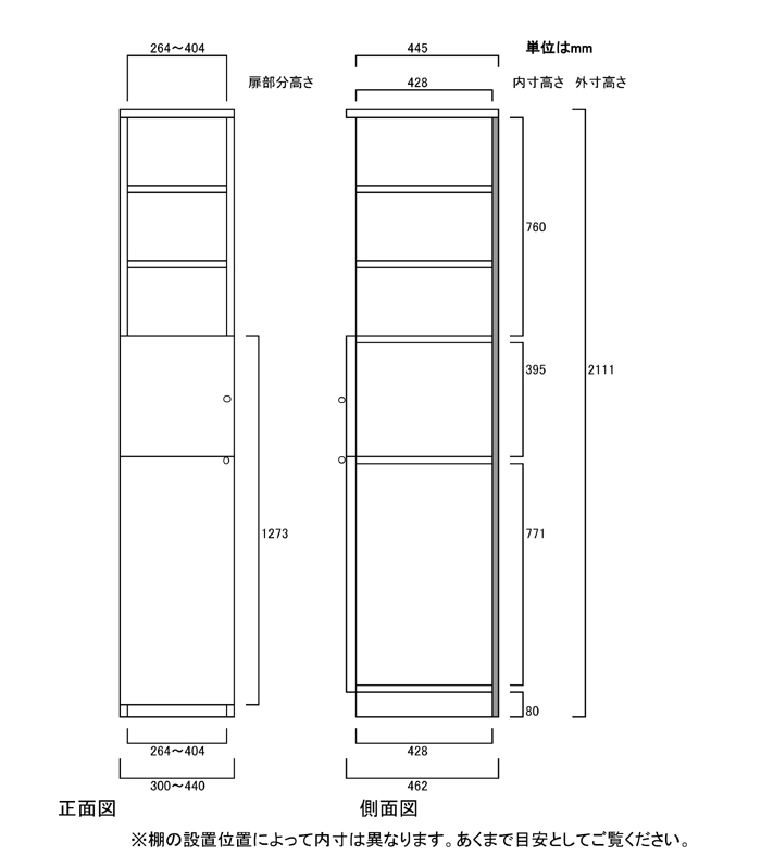 本体扉 幅15~44cmは片開き扉(右開き・左開きをご選択) 高さ135cm以上は上下分割扉