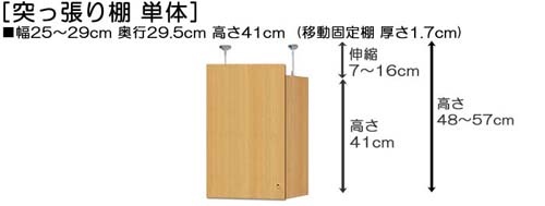 • 上置き棚A4天井突張りA3 高さ48~57cm幅25~29cm奥行29.5cm(本体奥行31cm用) 扉付き商品の棚の様子 突っ張り棚扉付き 突っ張り棚高さ図 寸法図