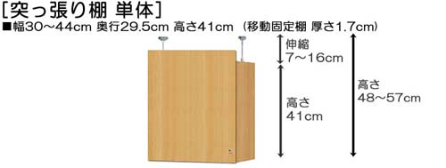 • 上置き棚A4天井突張りA3 高さ48~57cm幅30~44cm奥行29.5cm(本体奥行31cm用) 扉付き商品の棚の様子 突っ張り棚扉付き 突っ張り棚高さ図 寸法図