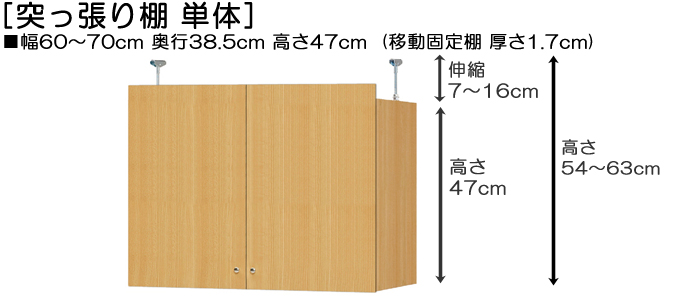 • 上置き棚A3つっぱり式A3 高さ54~63cm幅60~70cm奥行38.5cm(本体奥行40cm用) 扉付き商品の棚の様子 突っ張り棚扉付き 突っ張り棚高さ図 寸法図